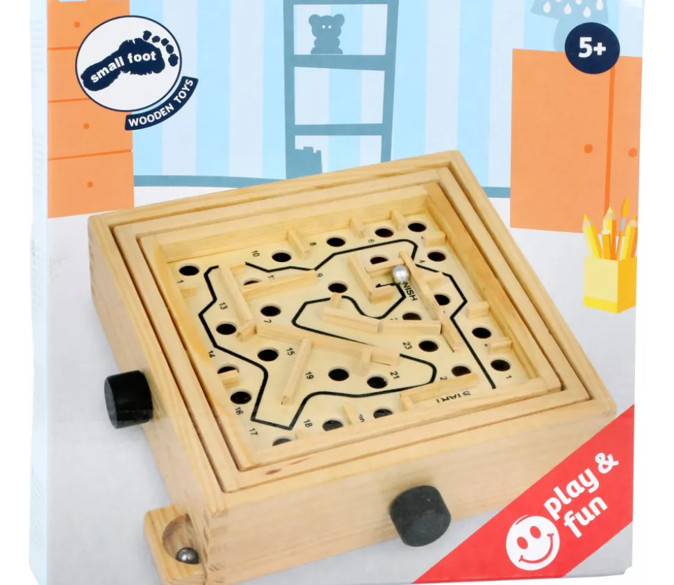 Un jeu de labyrinthe tout en bois. Bouger le plateau du labyrinthe et orienter la boule vers l’arrivée à travers le chemin indiqué sans tomber dans un des trous pièges.