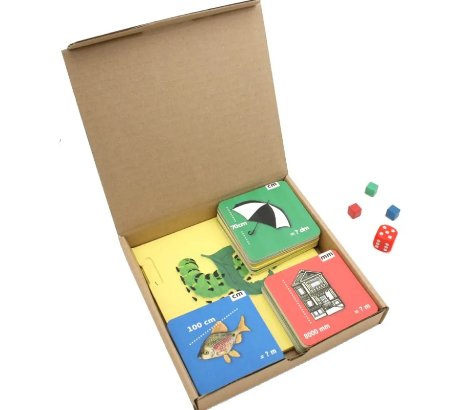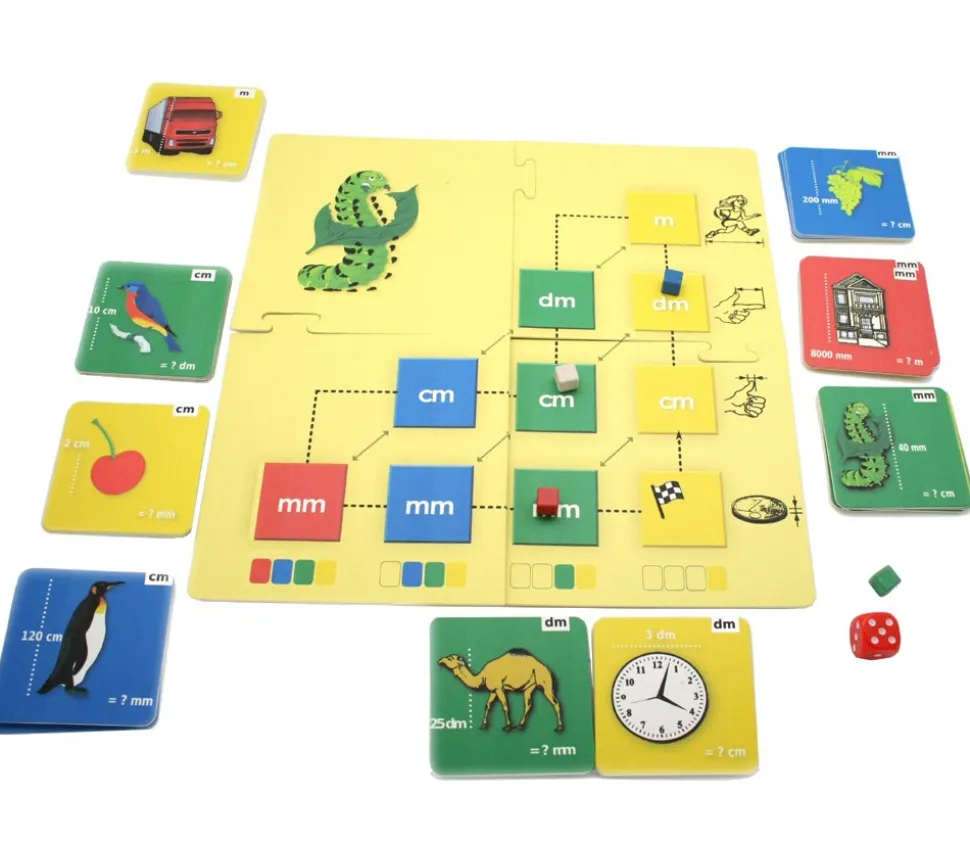 Jeu de math pour apprendre à convertir les unités de mesure de longueur : mètre, centimètre, décimètre et millimètre. Matériel éducatif pour jouer en apprenant.