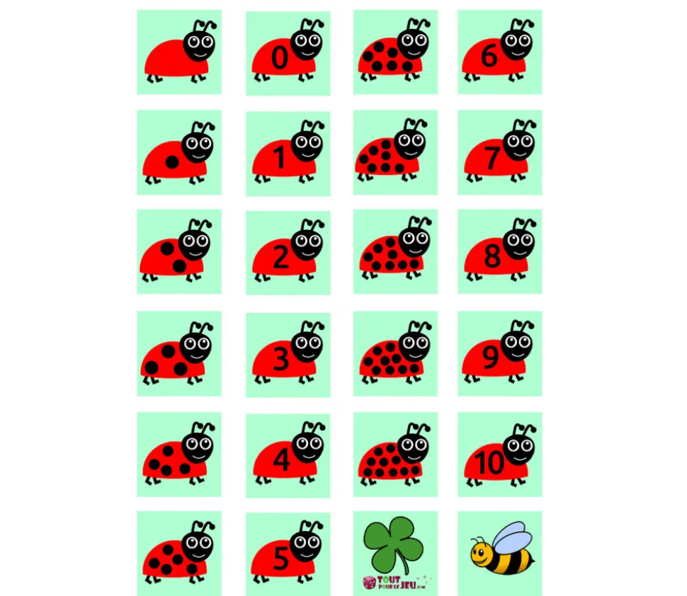 Mélanger toutes les cartes coccinelles face coccinelle visibles sur la table. Les enfants doivent essayer de retrouver les coccinelles qui ont la même valeur.