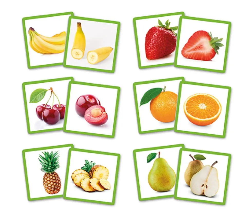 Chaque fruit est représenté de 2 façons : entier et coupé (vous pourrez donc aussi utiliser ce jeu sous forme de mémo).