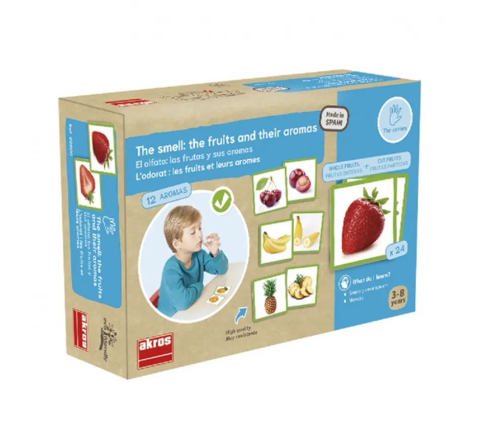 Jeu sur le sens de l’Odorat : fruits et leurs arômes. 24 cartes en cartons épais et rigide avec photos de fruits + 12 pots avec les arômes des fruits pour jouer avec les odeurs.