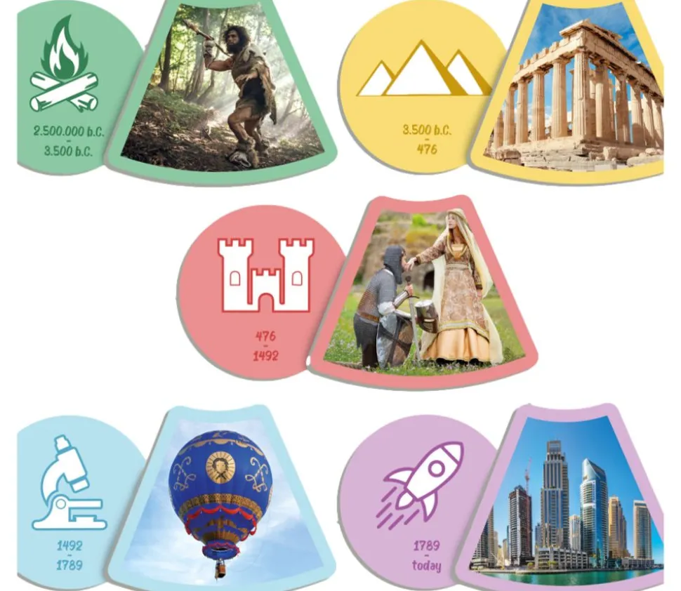 Le jeu possède différentes formes de jeu et peut être adapté à l’âge et aux connaissances des enfants. Les plus petits commencent par une simple association par des couleurs pour découvrir les caractéristiques de chacune des étapes de l’histoire de l’humanité. Les plus grands peuvent aussi apprendre à classer à quel domaine appartiennent ces caractéristiques, au sein de chaque étape.