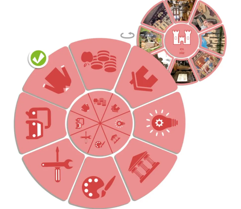 - 8 fiches avec les icônes des domaines (économie, architecture, peinture, transport, habillement, métier, maison, inventions)
