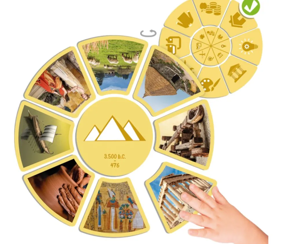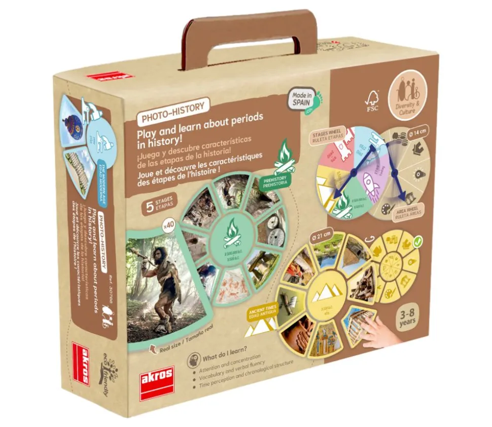 Découvre comment l’économie, les moyens de transport, l’architecture, la peinture, les métiers, l’habitat, l’habillement et certaines des inventions les plus représentatives ont évolué à travers les étapes de l’histoire. Comprend un grand puzzle avec la ligne chronologique du temps. Voyage à travers l’histoire en images et découvre comment nous avons évolué !