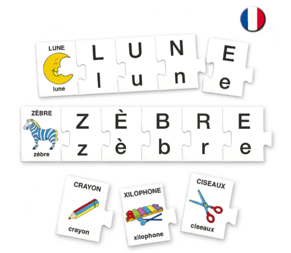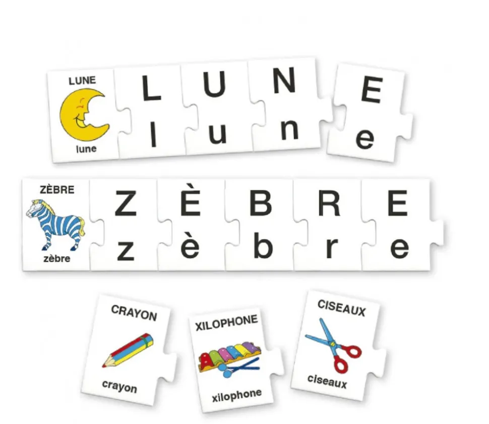 - 32 cartes format pièce de puzzle avec image et nom en lettres majuscules et minuscules – dimensions 5.8 x 4.9 cm
