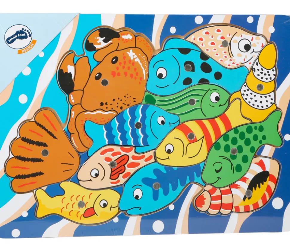 Puzzle jeu de pêche aimantée en bois avec différents animaux marins (crabes, poissons et coquillages) à attraper avec les cannes à pêche. Jeu de pêche à la ligne pour les enfants, jeu double puisqu’une fois pécher vous devez refaire le puzzle pour ranger tous les poissons sur le plateau en bois. Pêche aux poissons dans un bel univers marin. Pêchez les animaux les uns après les autres. Plateau de 29.3 x 21 cm avec 13 animaux en bois et 2 cannes à pêche avec aimants.
