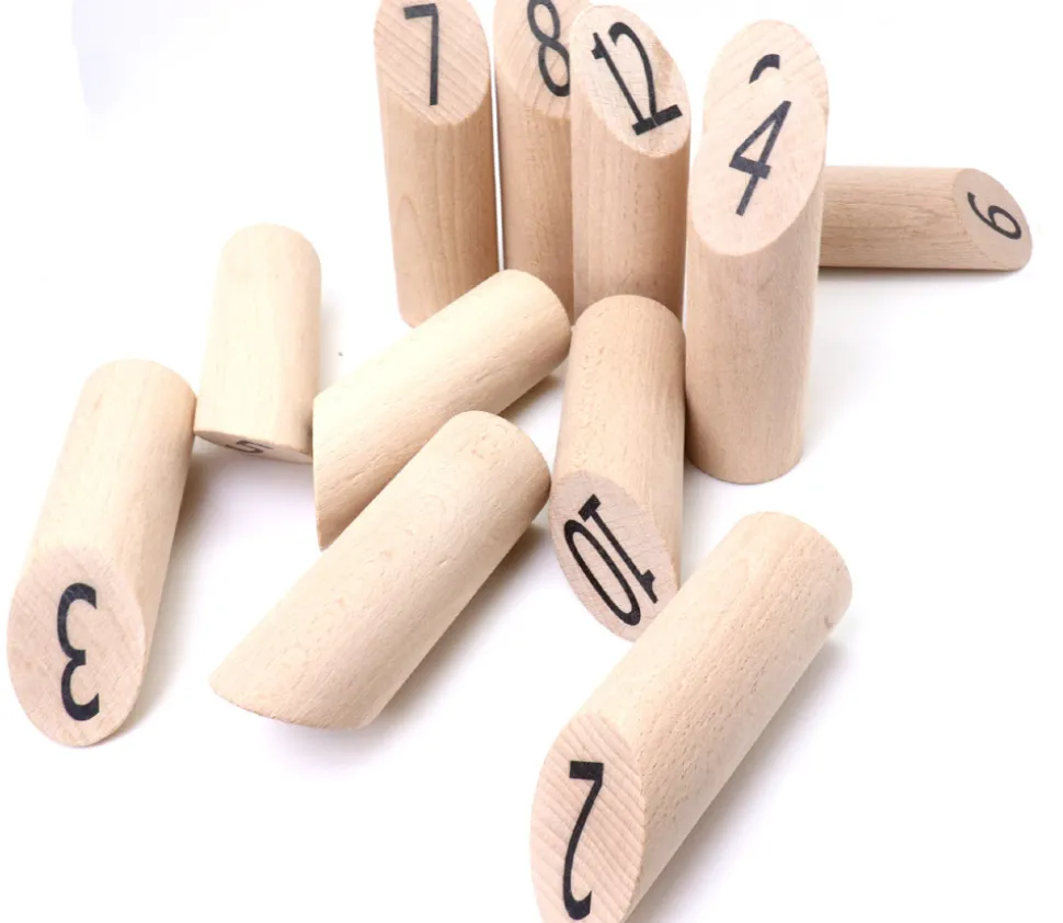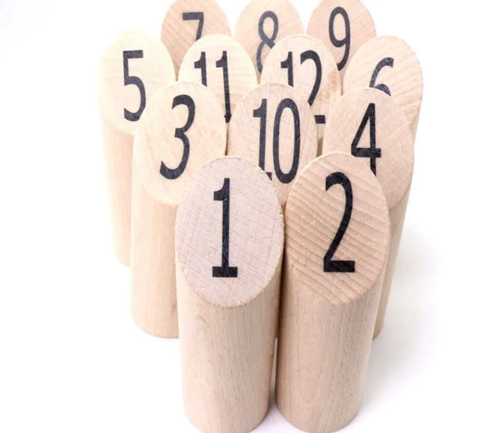 12 Quilles en bois de 15 cm de hauteur numérotées de 1 à 12 et un bâton de lancer de 22 cm de hauteur. Il faudra bien viser et être stratégique pour obtenir exactement 50 points.
