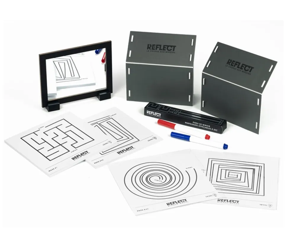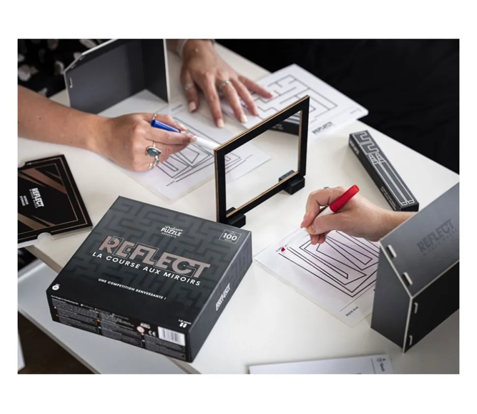 Jeu Reflect, la course aux miroirs. Un jeu original où vous allez essayer de tracer votre chemin pour sortir du labyrinthe. Mais attention tout est inversé dans le miroir ! Vous allez vous perdre… Jeu d’orientation.