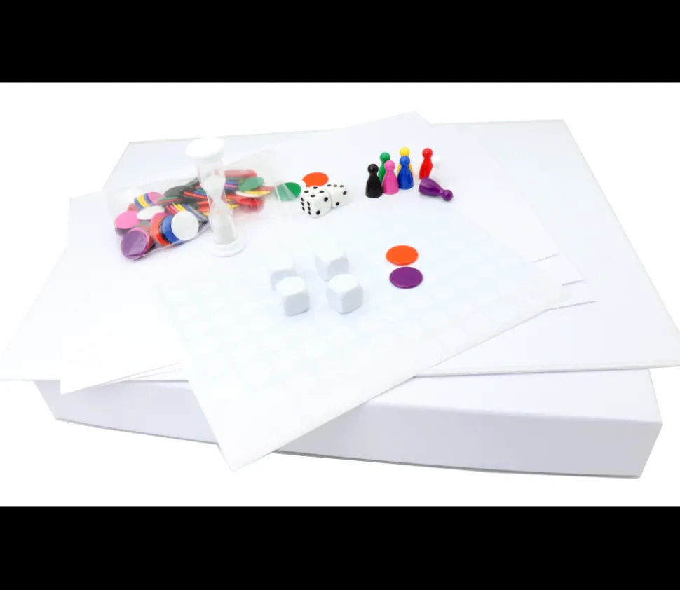 Un pack super complet pour créer votre jeu de société personnalisé. Plein d’accessoires pour vos créations : boite, plateau de jeu, cartes neutres, jetons, pions, dés, feuilles autocollantes imprimables…