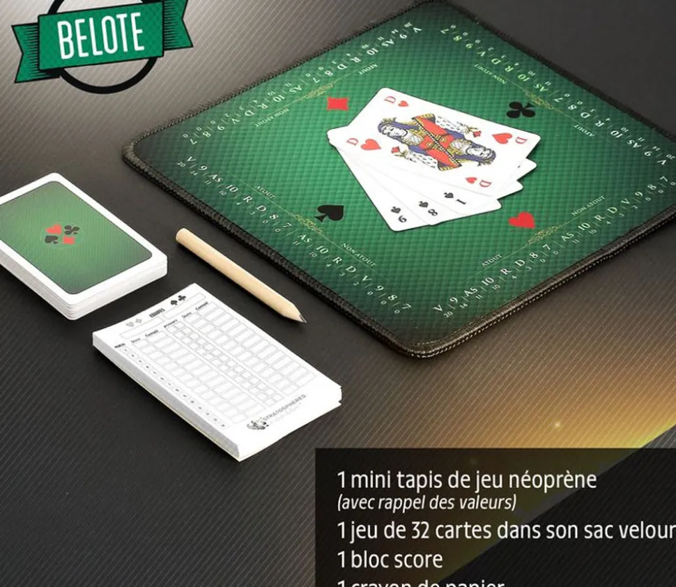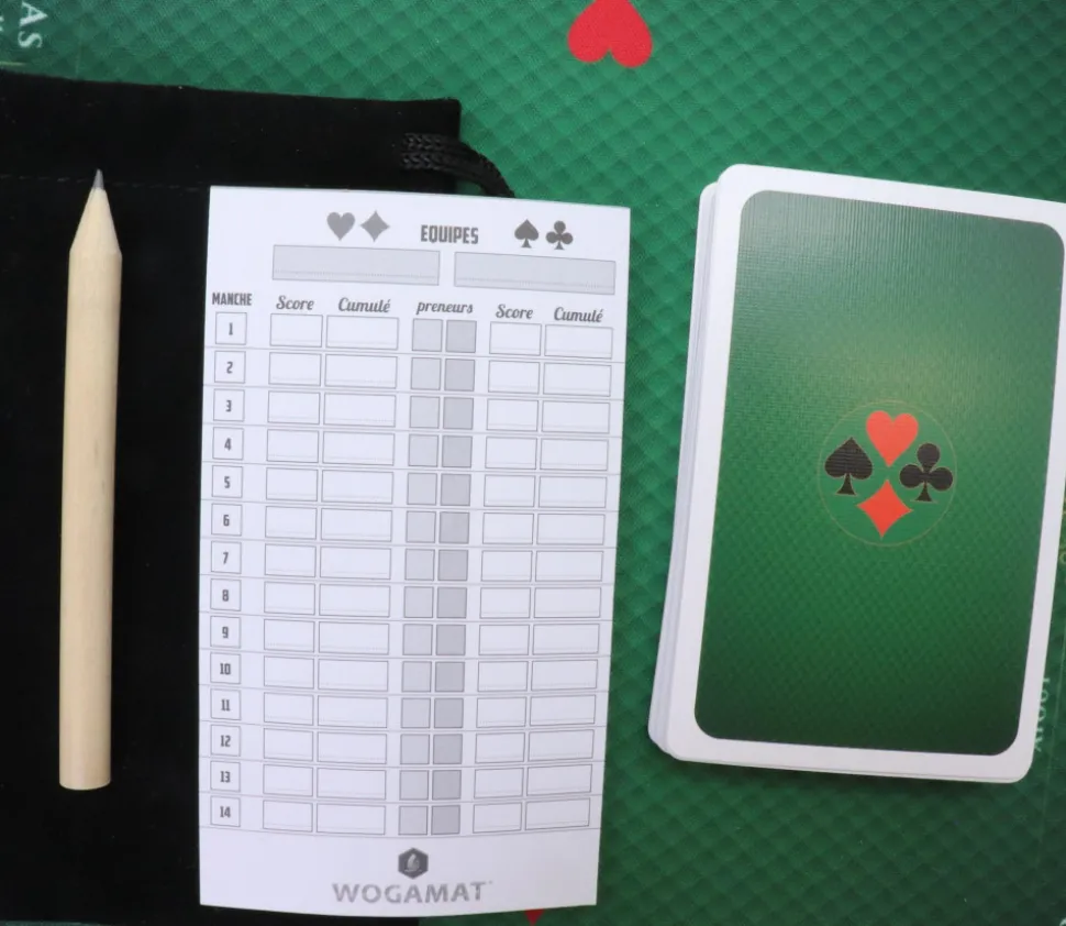 Tout pour la Belote game tubes : Ce kit est complet avec le tapis de carte, le jeu de 32 cartes, un bloc pour noter les scores et le crayon.