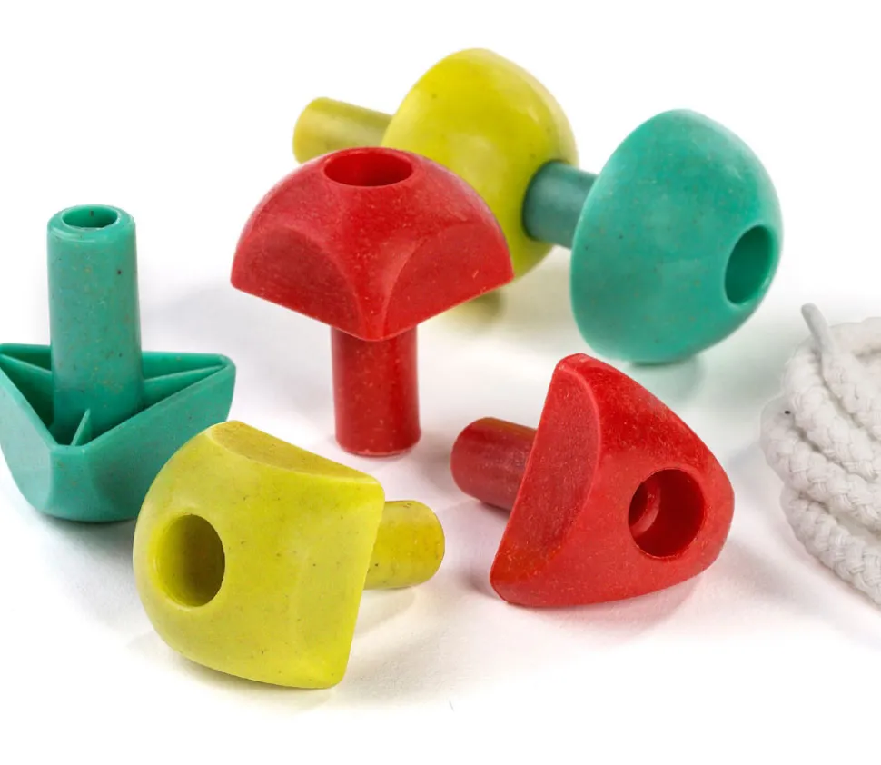 Jeu de motricité fine réalisé avec des matériaux écoresponsables (bois fibres d’épicéa, mousse recyclée et lacets en coton).