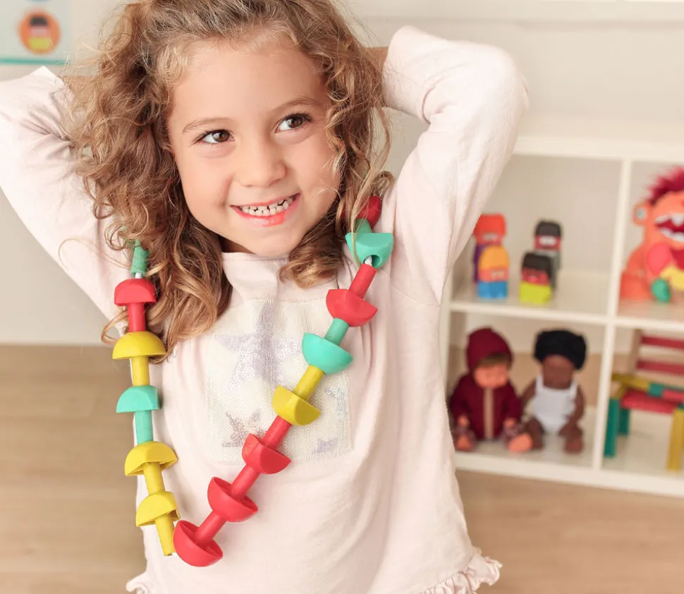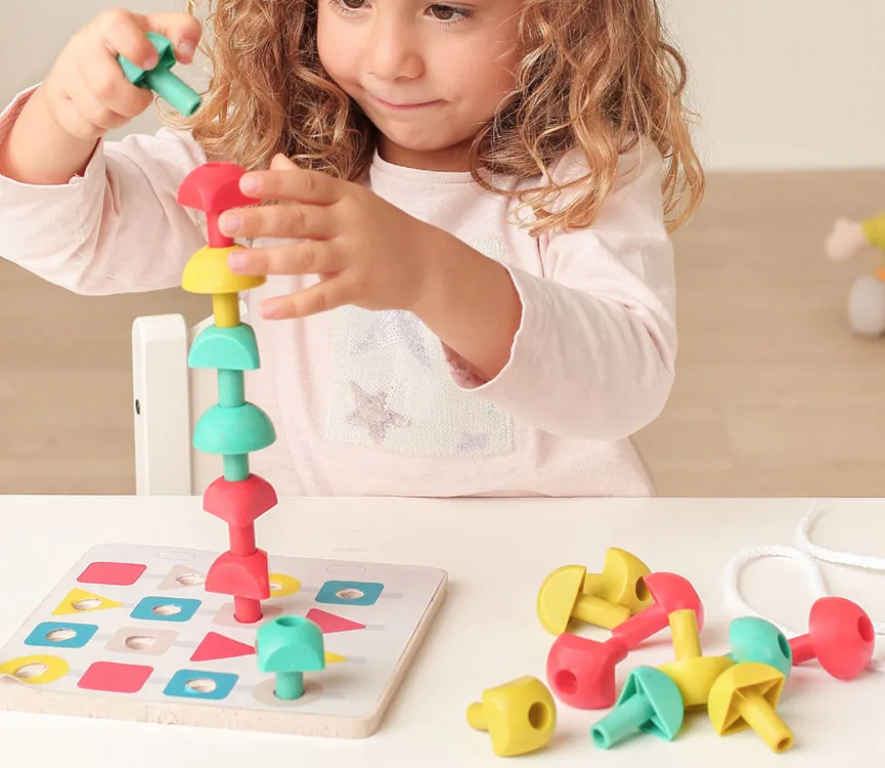 Les enfants pourront encastrer les pièces dans le plateau, enfiler dans les lacets pour faire des colliers, empiler pour faire des tours ou des construction, trier les couleurs ou les formes, reproduire les modèles des fiches. Matériel approuvé STEM
