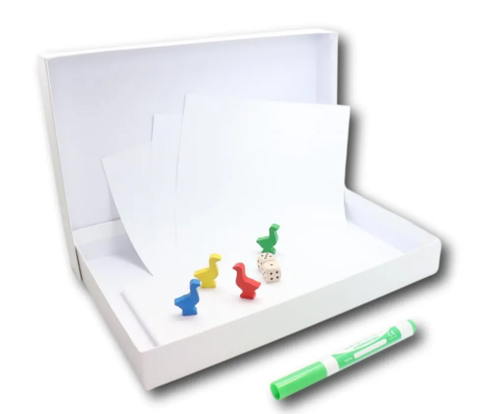 Un pack de démarrage pour créer votre jeu de l’oie personnalisé. 1 boite neutre rectangulaire, 1 plateau de jeu qui se replis en 2, des feuilles pour la personnalisation, 4 pions oie et 2 dés à jouer. Tout pour créer un jeu avec votre graphisme.