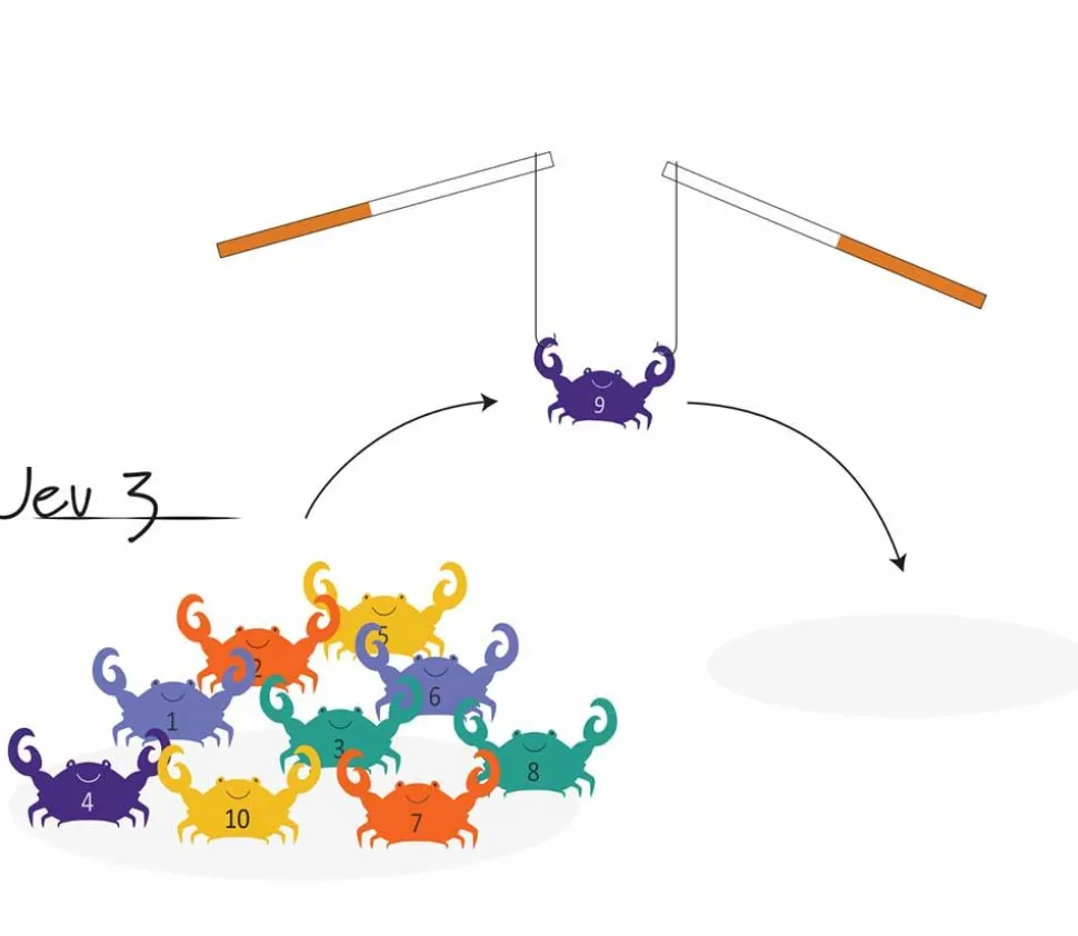 Jeu 1 : A deux joueurs, attrapez au plus vite tous les crabes placés aux centres. Les cannes à pêche en bois vous permettent grâce au crochet métallique de récupérer les crabes au niveau de leurs pinces. Faites glisser la ficelle entre leurs pinces, soulever la canne à pêche et hop vous avez réussi à en avoir un ! Continuez jusqu’à en avoir pêcher le plus possible ! Variante possible avec les numéros inscrits sur les crabes : on ne compte plus le nombre de crabe pêché mais le nombre de point récolté.
