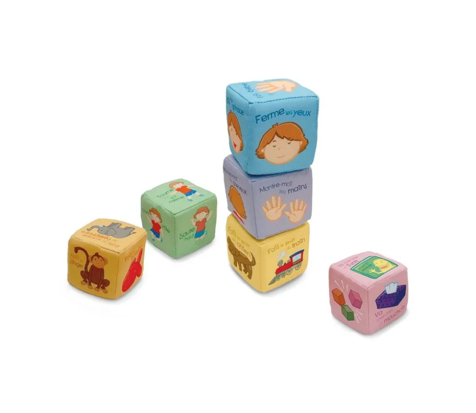 Ce jeu comprend 6 dés à jouer différents de grosses dimensions tout doux qui donnent envie de jouer. Les images et consignes sont toutes différentes.