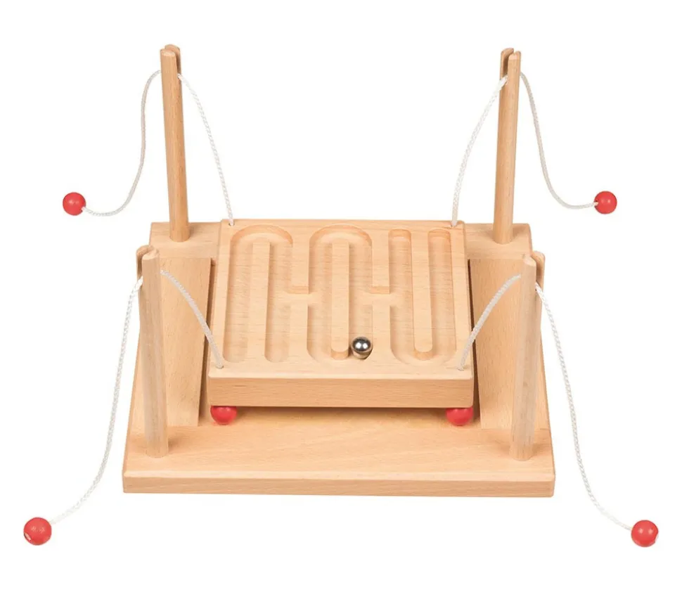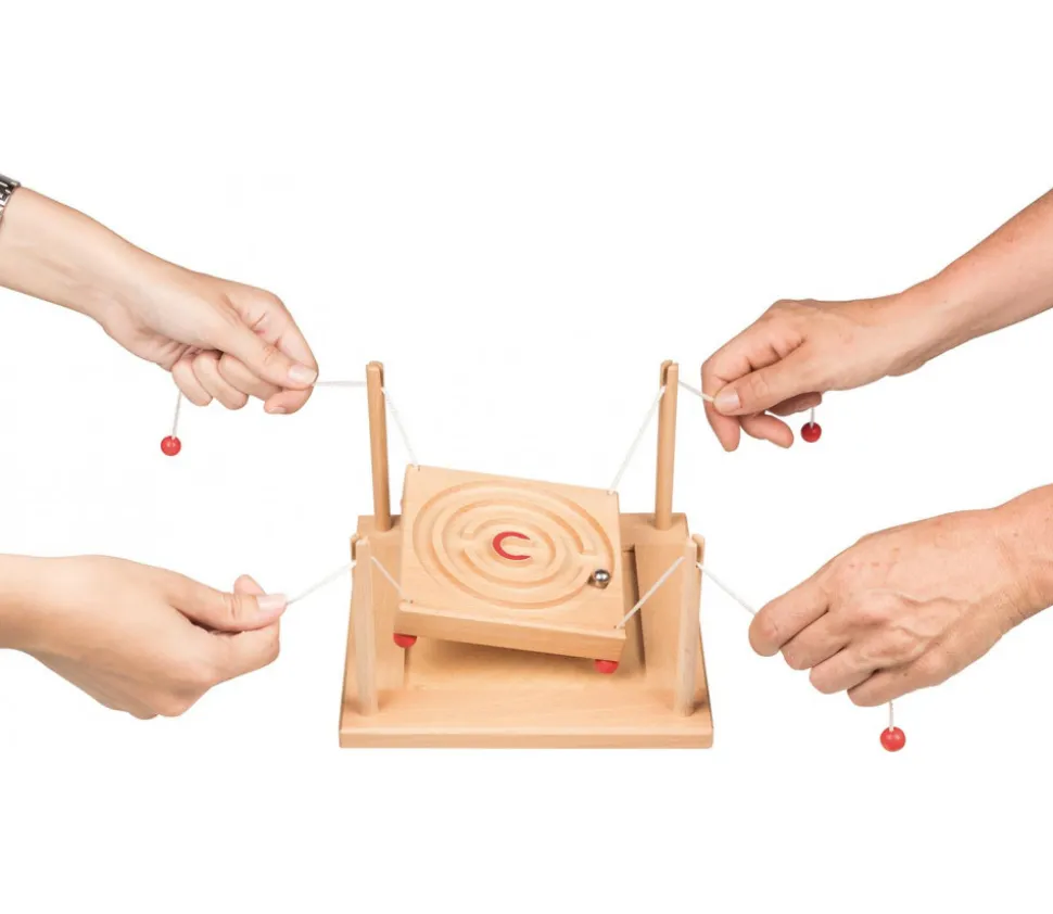 Labyrinthe coopératif avec plateau réversible. Jeu d’équipe et de coordination pour 2 où 4 joueurs. Il faut bien se mettre d’accord et communiquer ensemble pour faire avancer ensemble la bille où on le souhaite. Jeu d’adresse pour jouer en équipe et guider la bille à travers l’un des deux labyrinthes (1 labyrinthe différent sur chaque face). Les joueurs devrons bouger et tirer doucement sur la ficelle pour faire bouger le plateau et guider la bille vers l’arrivée.