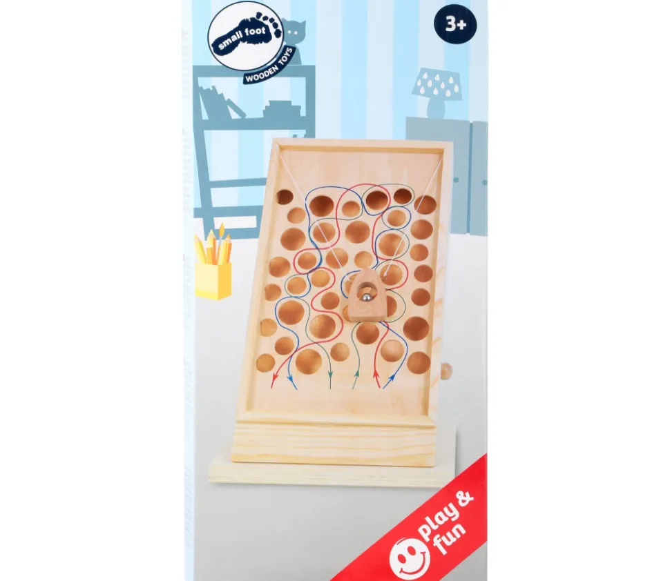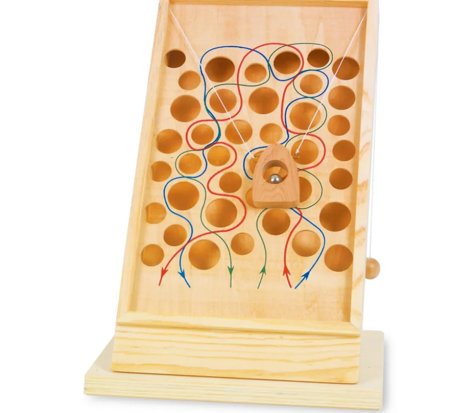 Jeu de labyrinthe en bois, parcours vertical. Jeu d’adresse traditionnel avec plusieurs chemins à faire parcourir à la balle sans la faire tomber dans les trous. Agilité et patience, un très bon exercice de motricité. Différents chemins de couleurs. Jeu de 35.8 x 20 x 4.3 cm avec une bille. Faites bouger les ficelles de chaque côté pour guider la boule sur le parcours.