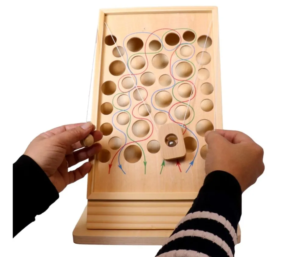 Un jeu de parcours qui se tient à la vertical où vous devrez faire se déplacer la boule le long d’un des chemins sans la faire tomber dans un des trous du parcours. Bouger doucement les deux cordes qui sont sur les côtés pour orienter la boule sur le labyrinthe vers l’arrivée à travers le chemin indiqué sans tomber dans un des trous pièges.