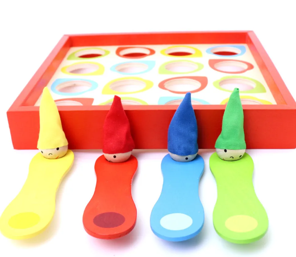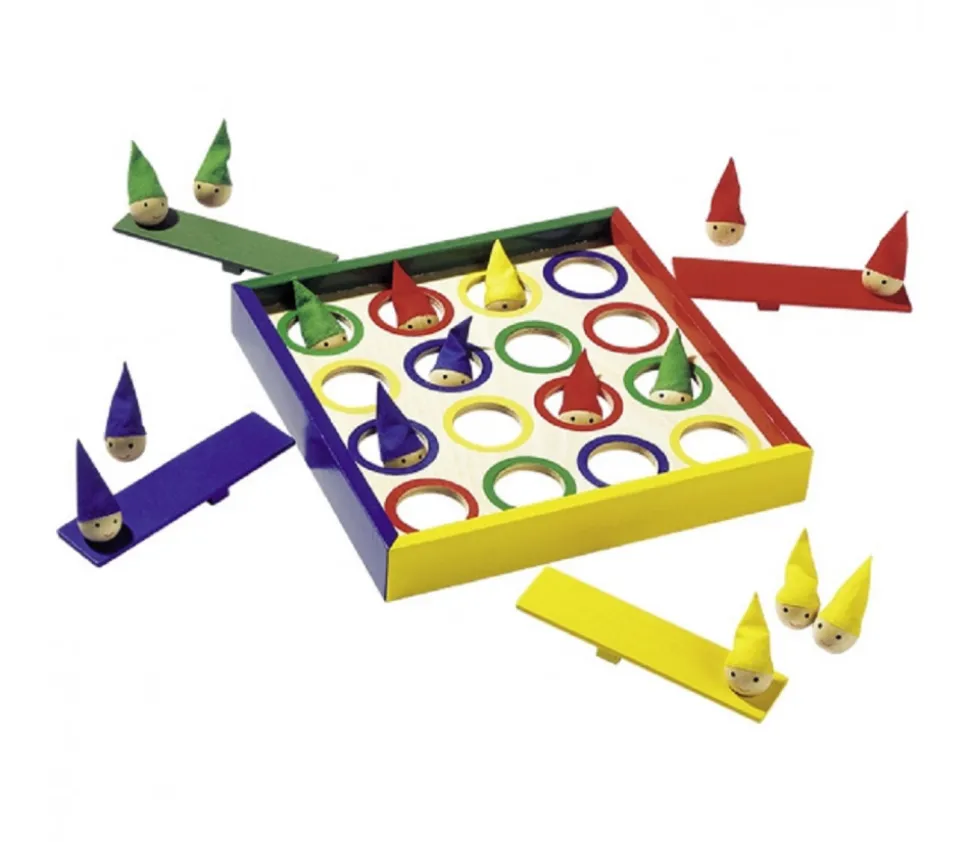 Jeu de société en bois pour les enfants simple et rapide. Petits personnages lutins qui donnent envie de jouer aux enfants.