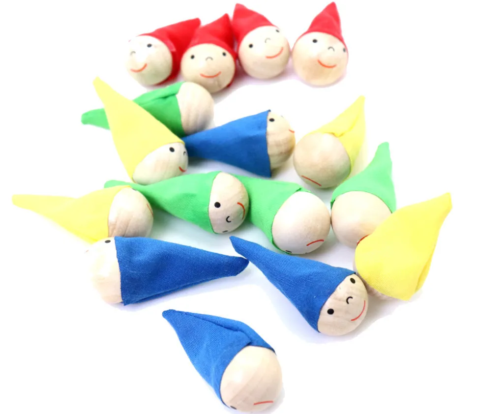 Jeu très amusant de coordination et motricité fine pour les enfants à partir de 4 ans composé d’un plateau de jeu de 20x 20 cm avec 16 cibles colorées, 4 catapultes en bois et 16 petits lutins tout mignons avec tête en bois et bonnet en tissus (4 de chaque couleur).