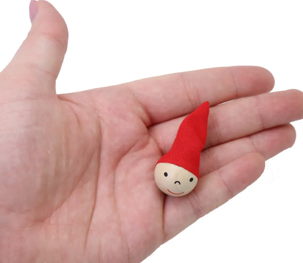 - 16 lutins tête en bois naturel et bonnet en tissus de 4 couleurs différentes : bleu, rouge, jaune, vert – Dimensions : 3 x 2 cm