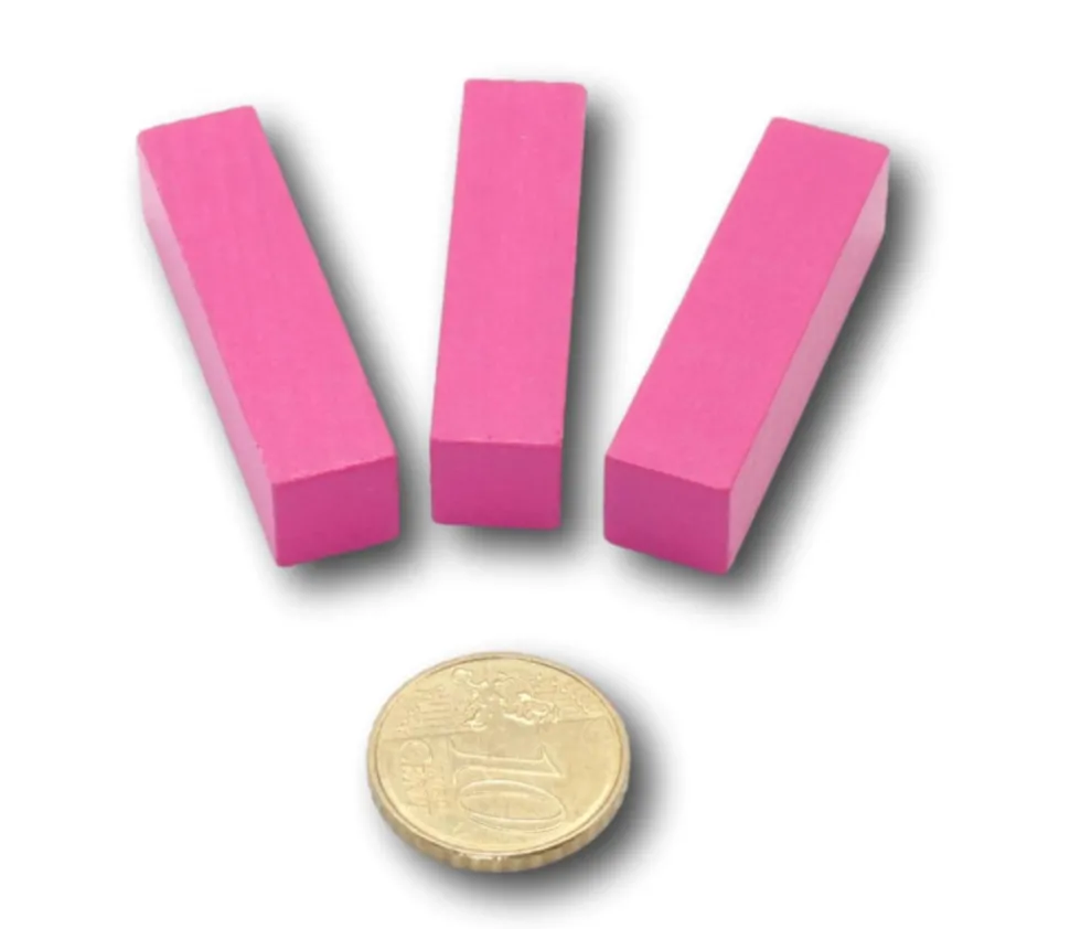 Set de 3 Bâtonnets en bois colorés en rose de 40 x 10 x 10 mm. Pions en bois pour vos jeux.