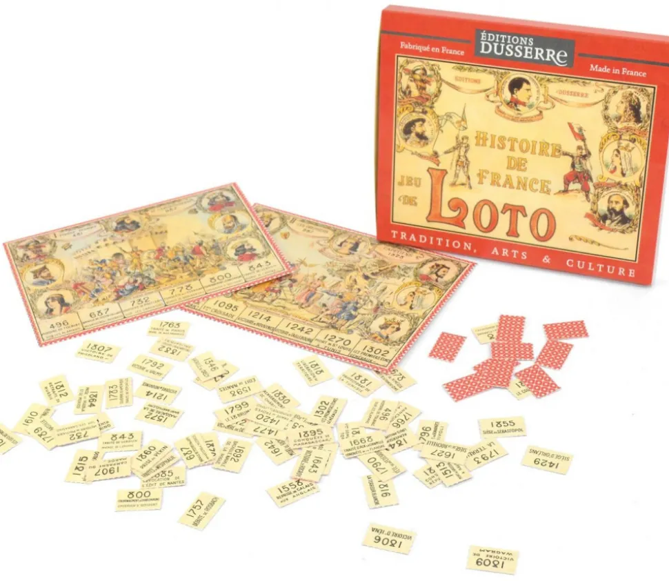 Jeu loto de Histoire de France comprend 12 plaques cartonnées illustrés représentant 12 périodes de l’Histoire de France. En bas de chaque carton, 6 dates importantes. Ces dates tiennent lieu de numéros. Ces mêmes numéros se retrouvent sous forme de jetons qui constituent les « pions » du loto. But du jeu être le premier à remplir son carton de loto.
