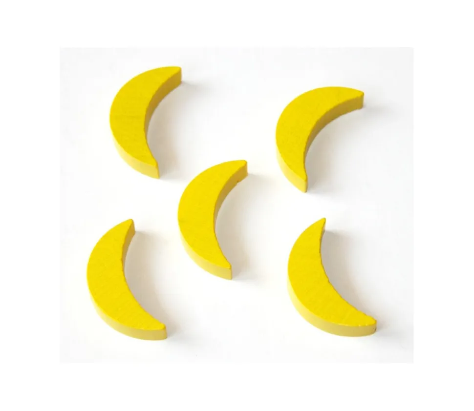 Lune jaune en bois de 3.5 x 1.8 x 0.8 cm. Pièce en forme de croissant pour jeux.