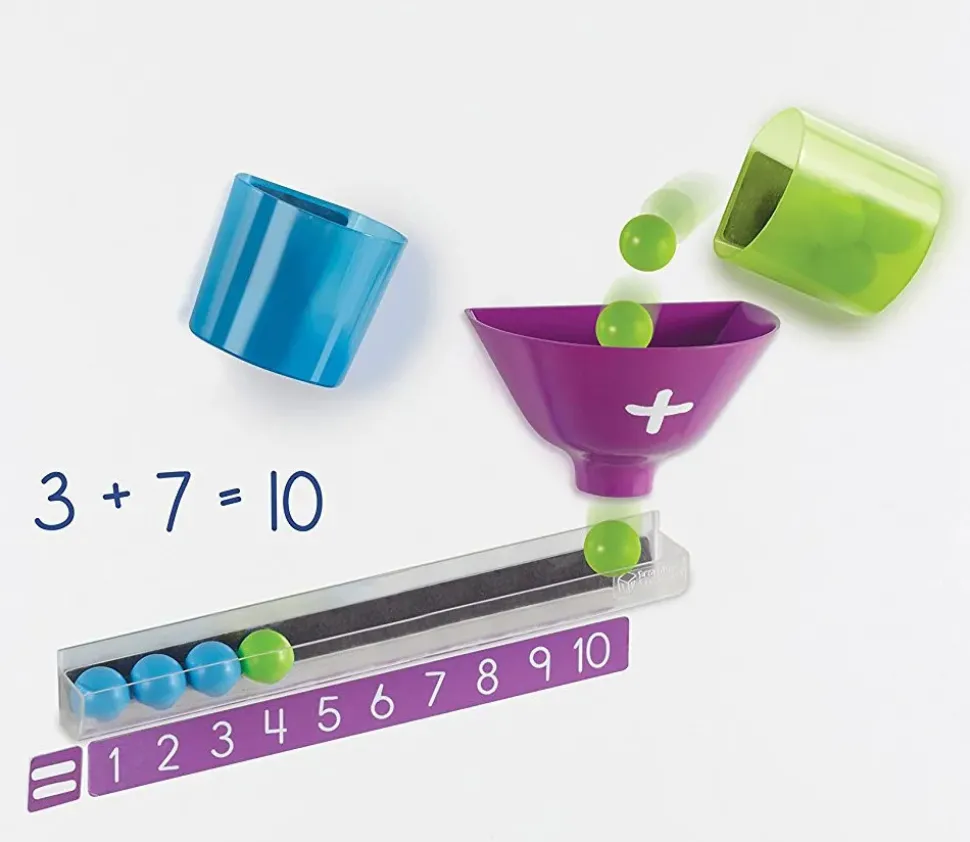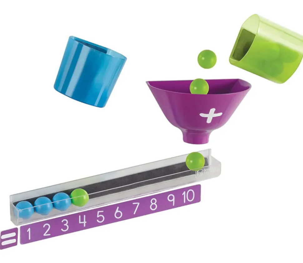 Trois étapes faciles pour illustrer l’addition de base : Mettez les boules dans le gobelet correspondant, inclinez les gobelets pour que les boules tombent dans l’entonnoir. Comptez les balles lorsqu’elles atterrissent dans le plateau numéroté en bas