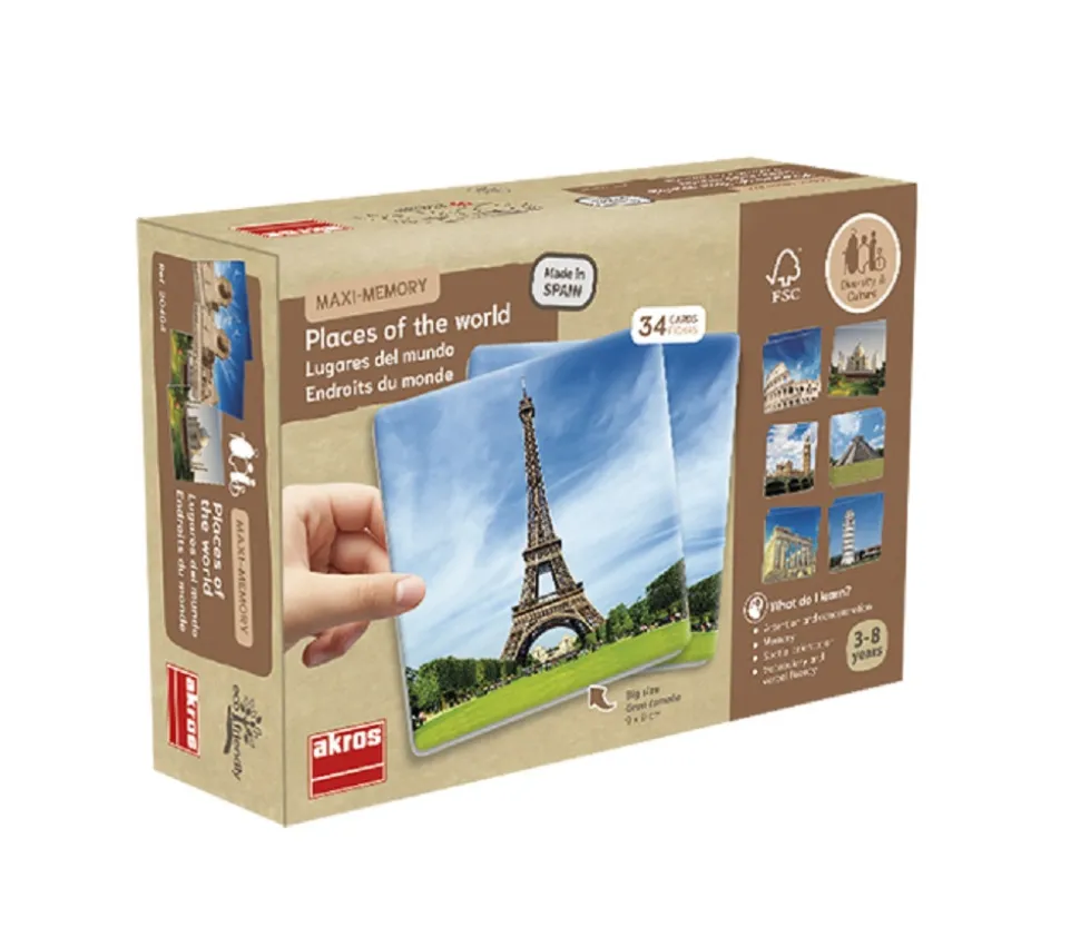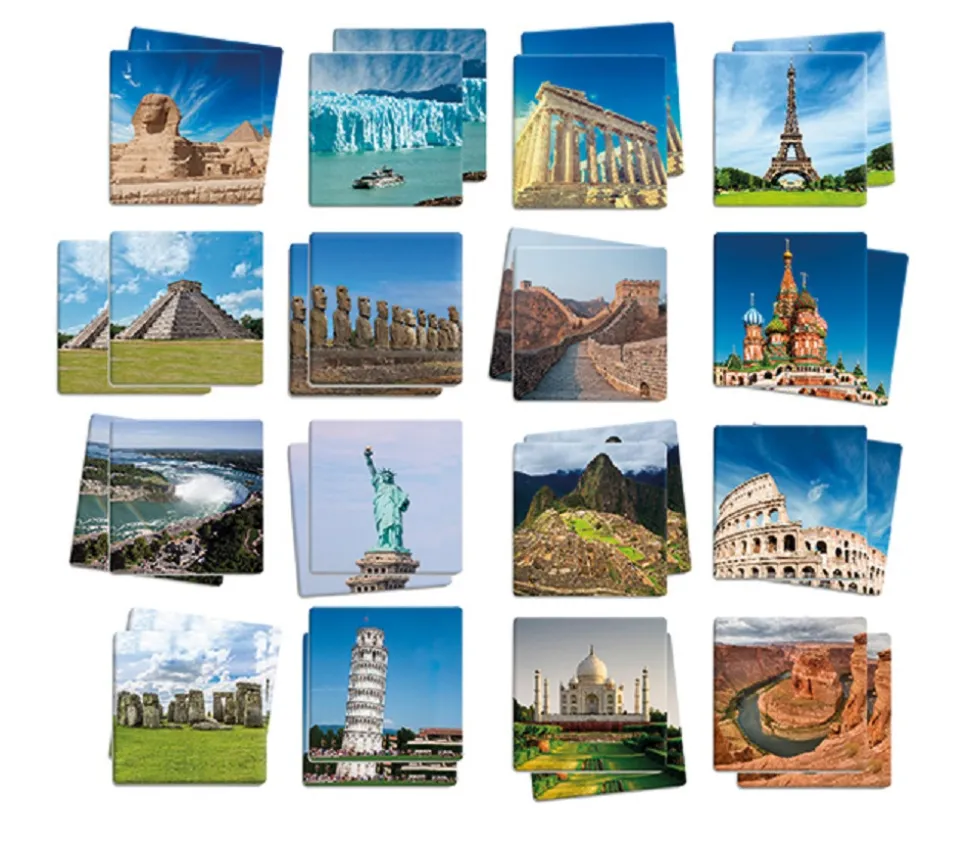 Maxi mémory 34 cartes pour jouer à la découverte du monde. 34 lieux incontournables à connaitre sont représentés sur les cartes avec de belles photos.