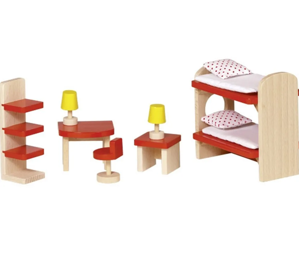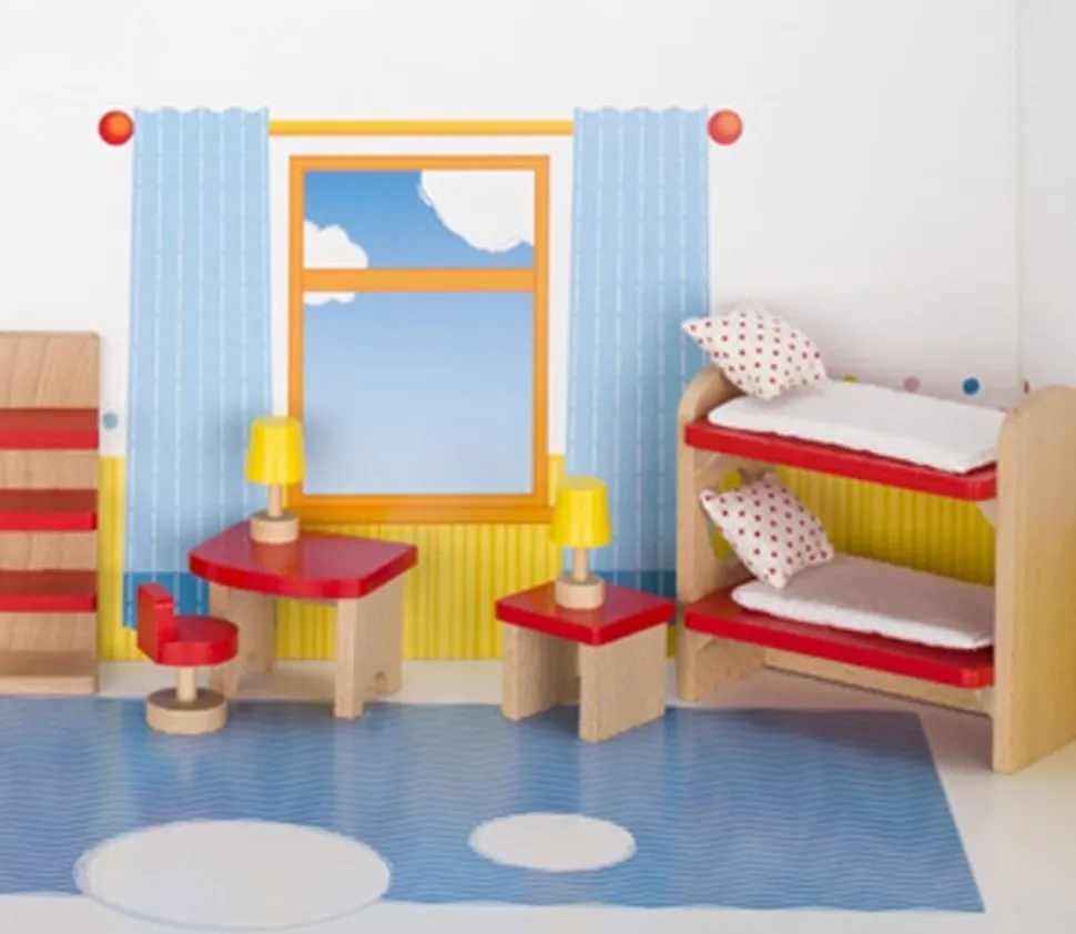 Accessoires tout en bois de belle qualité pour de la décoration et les jeux d’imitation des petites filles et garçons. Recréer des mini maisons et vos mondes imaginaires avec ces accessoires : lit superposé, matelas, coussins, table de nuit, lampes, bureau, chaise, armoire.