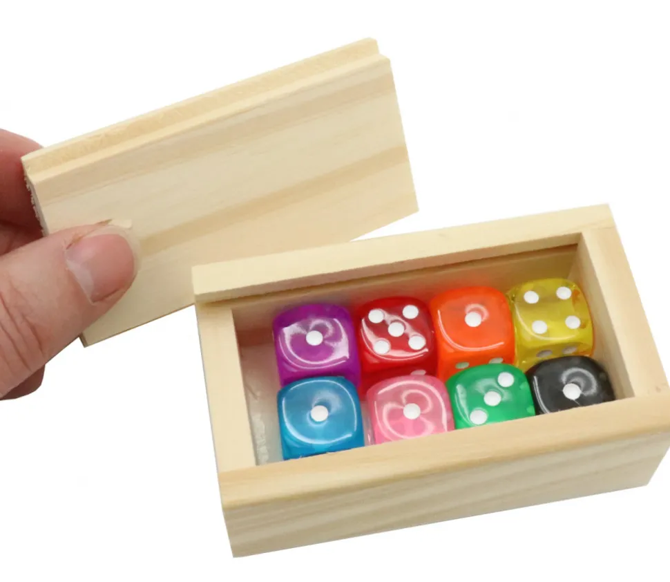 Boite en bois brut qui se ferme grâce à un couvercle que vous faites coulisser sur le côté. Très pratique pour le rangement de petites pièces. Vous pourrez par exemple y ranger : 7 dés multi-faces, 8 pions joueurs ou 8 dés à jouer.