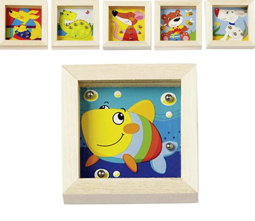 Casse tête carré avec tour en bois naturel et fond animal peint et une petite vitre en plexi pour retenir les billes