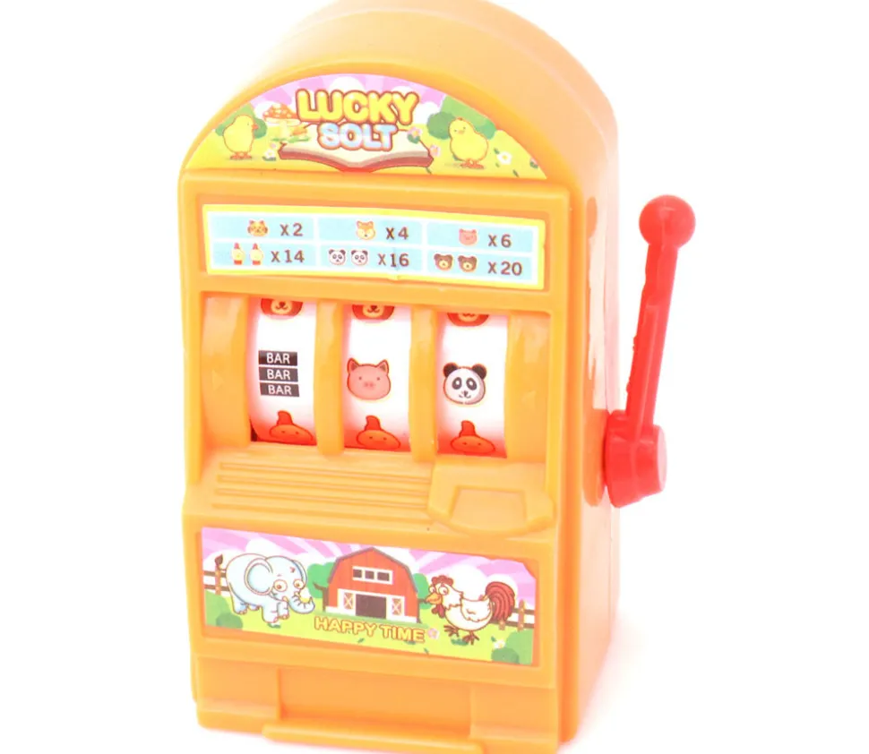 Petit jeu machine à sou pas cher. Machine en sou en plastique avec manche à actionner pour aligner les 3 dessins.