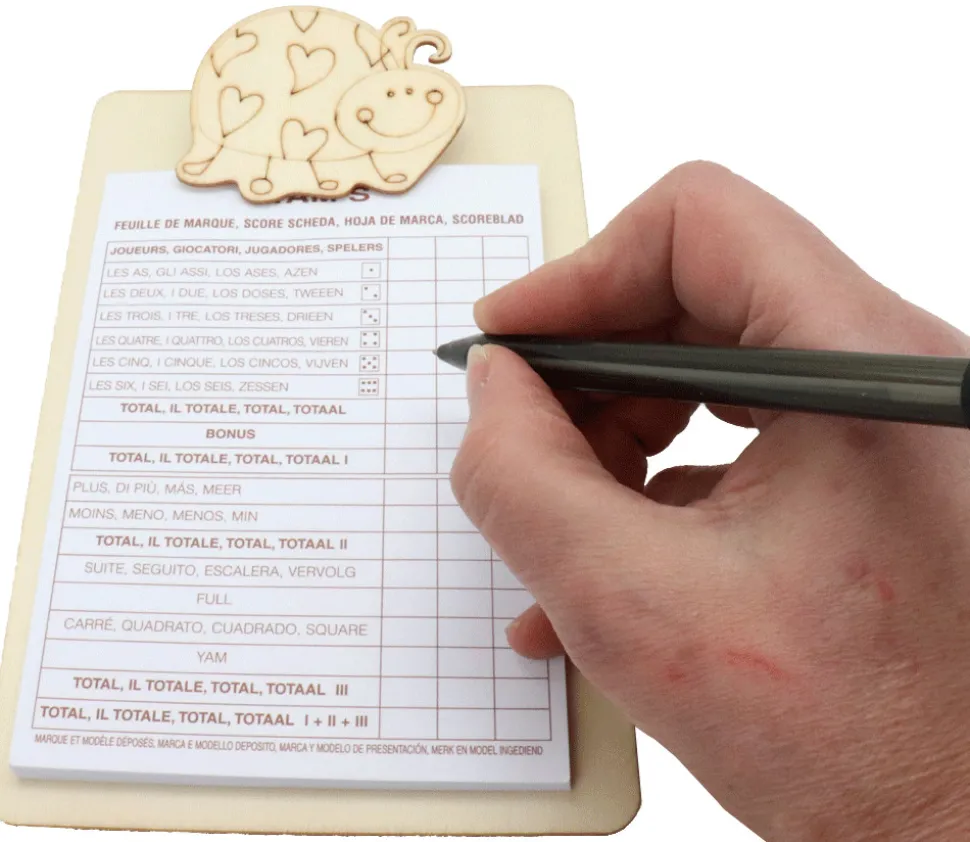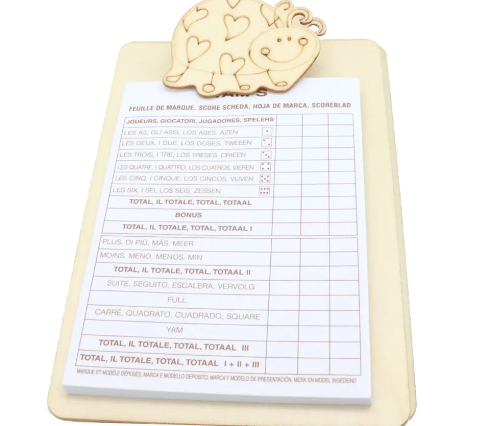 Tablette d’écriture très pratique pour noter les points ou indices dans vos animations de jeux. Porte bloc en bois, support pour noter les points. Clip en forme de coccinelle.