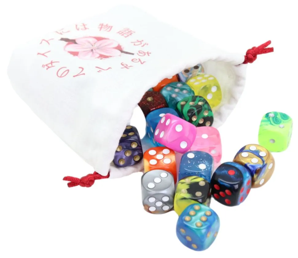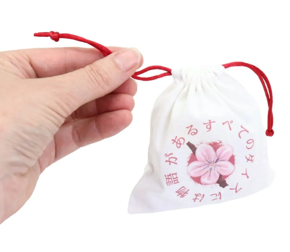 L’imprimé représente un Sakura sur la branche d’un cerisier, entourée de la phrase « Tous les dés racontent une histoire » écrite en écriture japonaise.