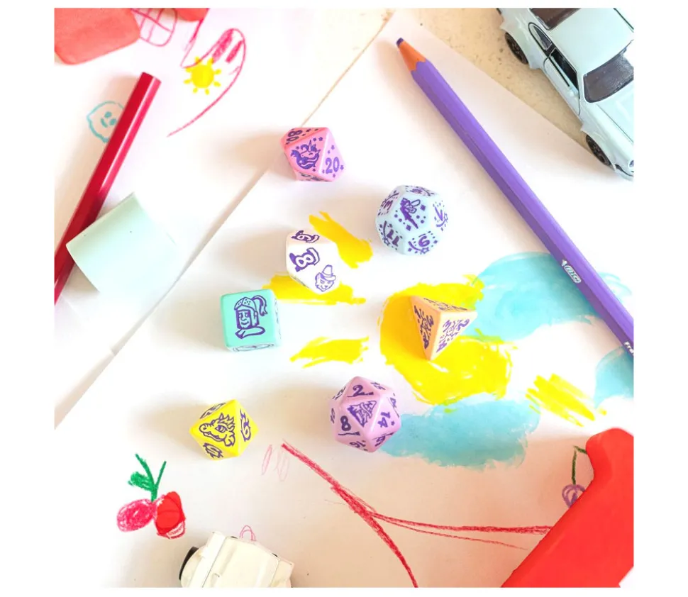 7 Dés multi-faces bien lisibles avec un graphisme adorable qui ravira les enfants ou les grands avec son style kawaii.