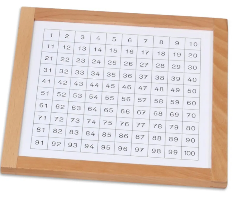 Plateau en bois avec chiffres de 1 à 100 pour jeux de sur les nombres et les calculs. Cadre en bois de 27 x 27 cm avec sur une face les 100 cases de 2 x 2 cm avec inscription en noir de chiffres. Matériel Montessori complémentaire au set plateau de calcul (vendu séparément). Carte de contrôle pour la table de 100.