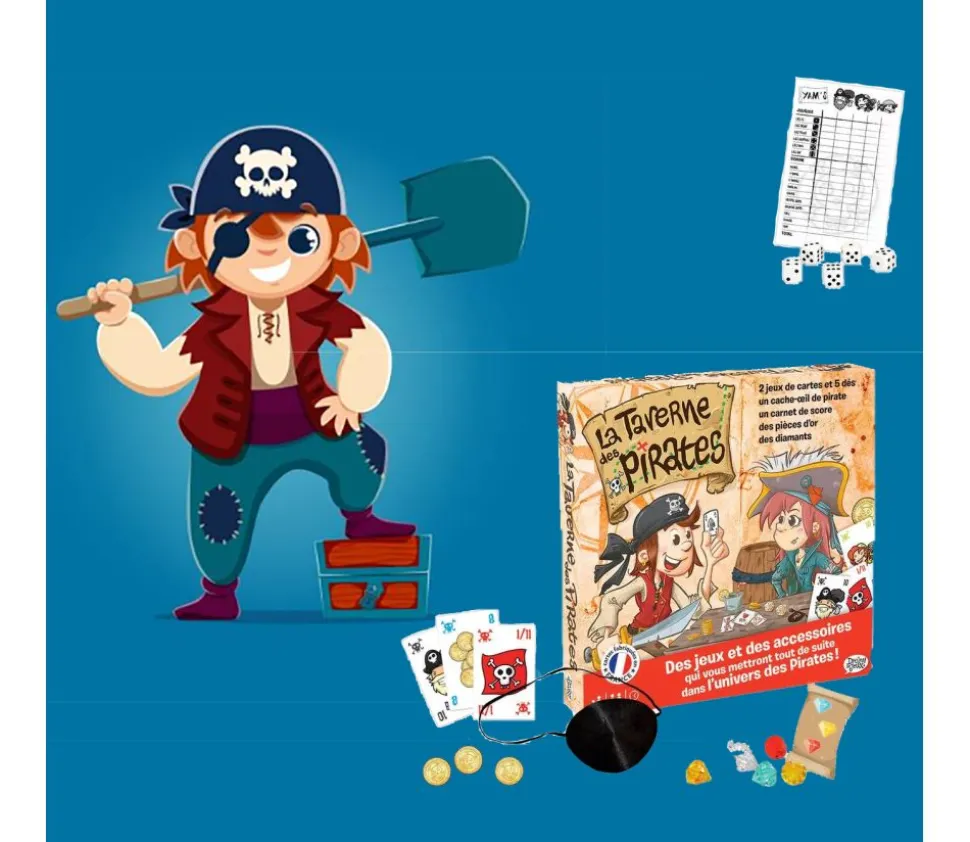 Ce kit comprend : 1 jeu de 55 cartes : Jack le Pirate, 1 jeu de 44 cartes : Joyeux Joyaux, 5 dés, 1 bloc-notes Yams Pirate, 1 cache-œil, 32 faux diamants, 10 pièces de trésor et 1 sac en tissu.