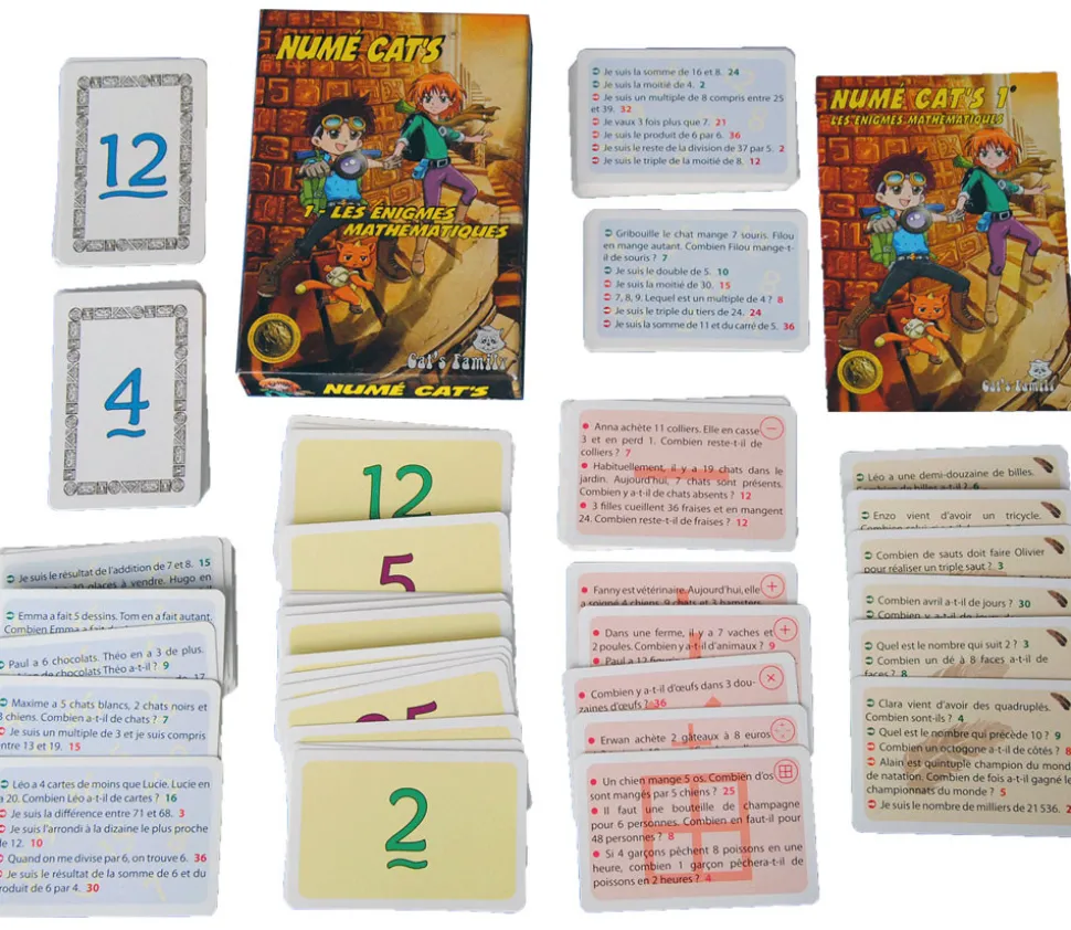 110 cartes : 72 cartes Énigmes (soit 330 énigmes), 18 cartes Nombre, 20 cartes Calcul.