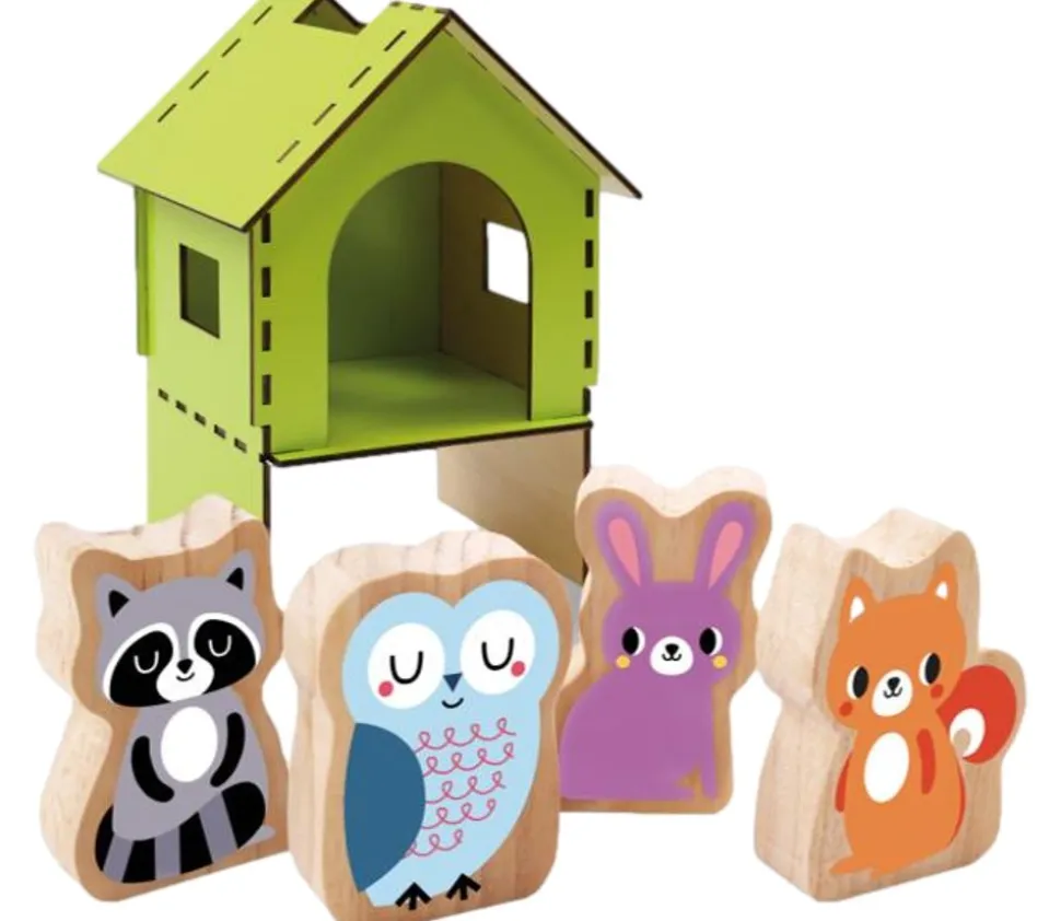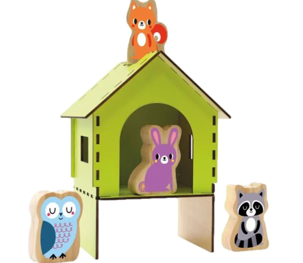 Un superbe jeu avec animaux à positionner sur les zones de la maison en bois.