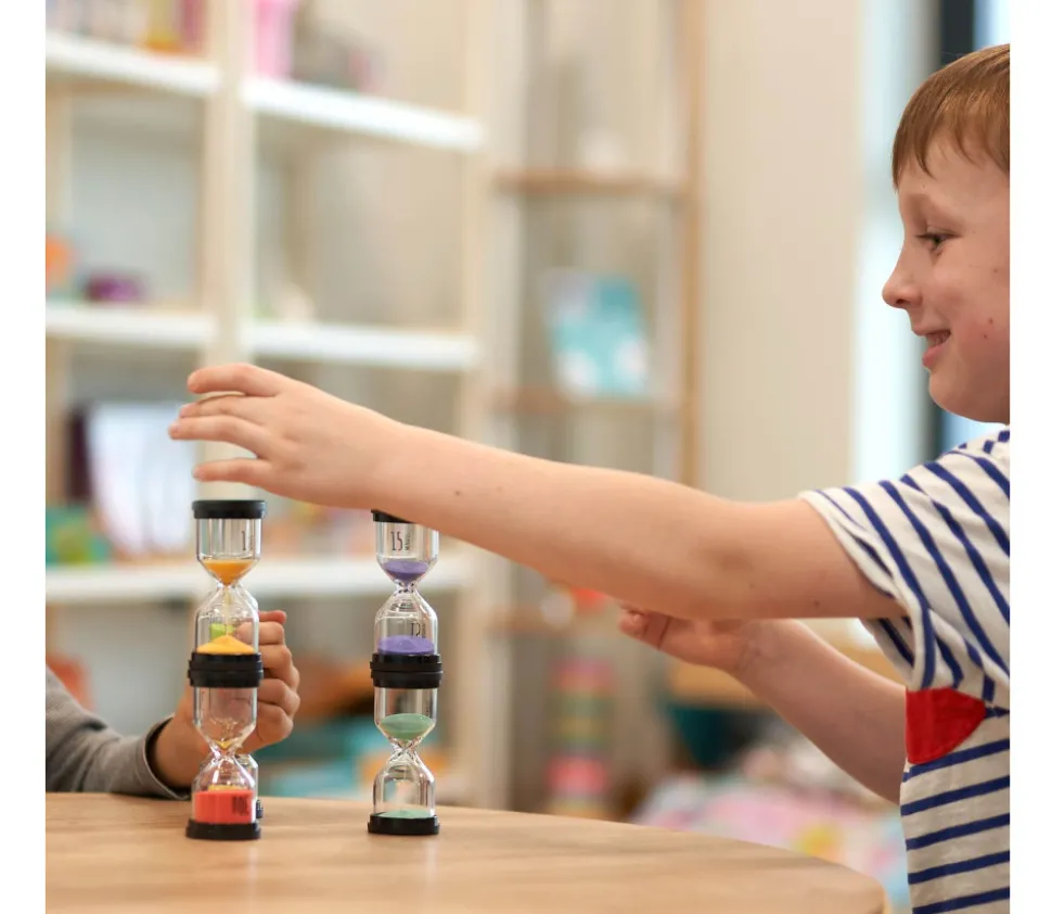 Sabliers en verre et PVC avec une couleur associée à chaque durée pour faciliter l’apprentissage chez les enfants.