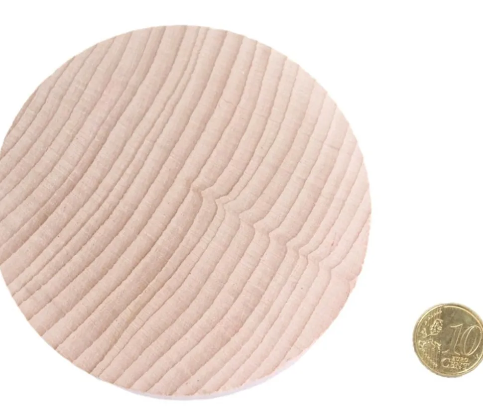 Palets ronds en bois naturel sans teinte XXL. Palet en hêtre d’environ 10 cm de diamètre et de 1.5 cm d’épaisseur.