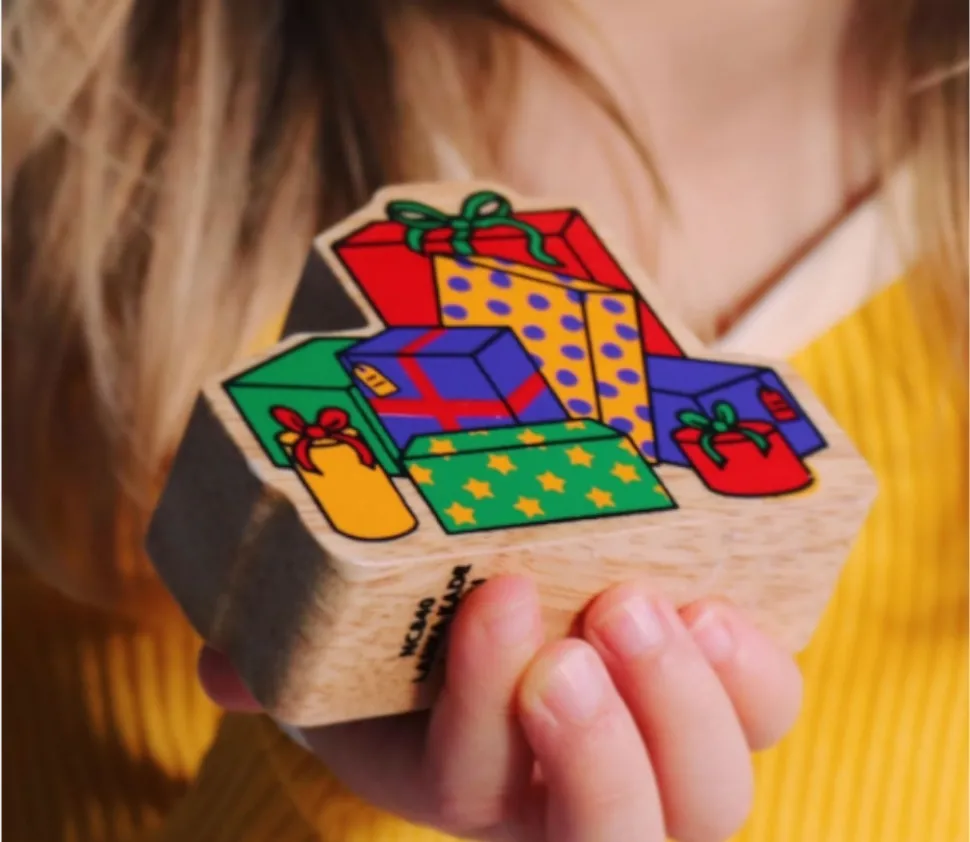 Figurine tout en bois massif coloré représentant un tas de paquets cadeaux. Grosses pièces bien stables pour jeux, jouets enfants ou décorations.