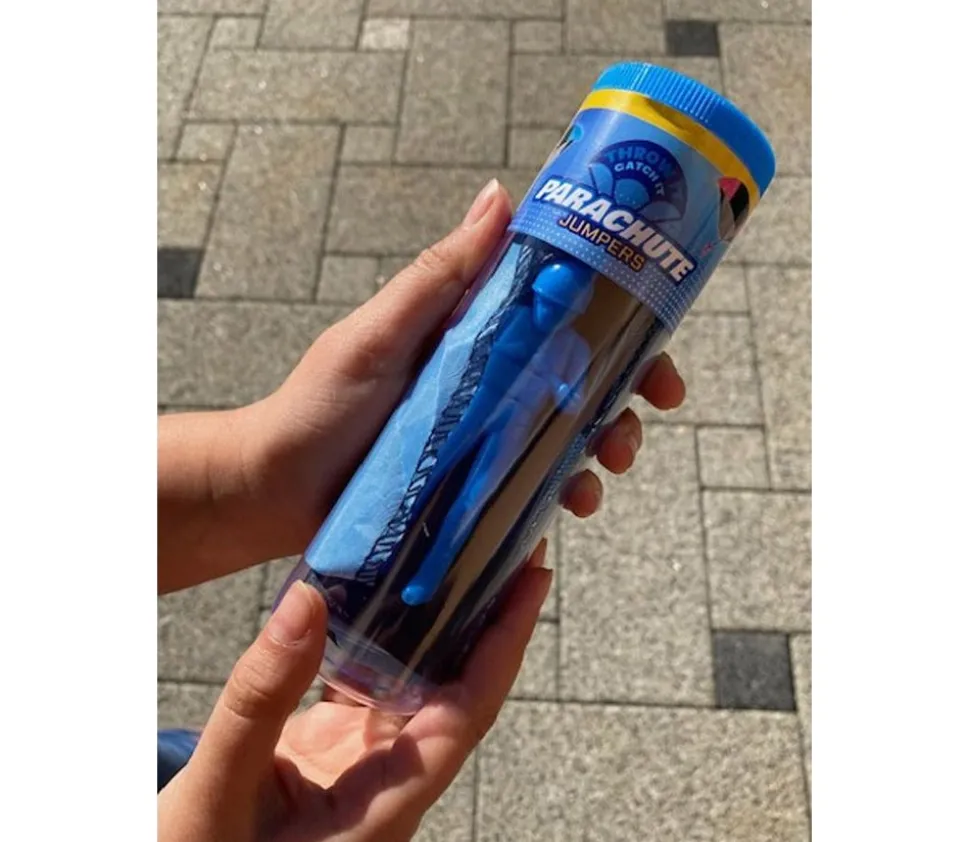 La figurine mesure 9-10 cm et le parachute environ 40 cm de diamètre et son coloris est aléatoire. (bleu, jaune, rose, orange).