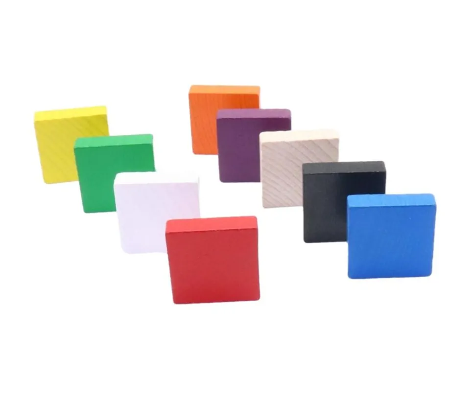 Pavé en bois coloré. Petit carré de 30 x 30 x 8 mm. Pion pavé pour vos jeux de société. Jeton carré en bois disponible en 8 couleurs à choisir : rouge, vert, jaune, bleu, vert clair, naturel (verni), noir et blanc.