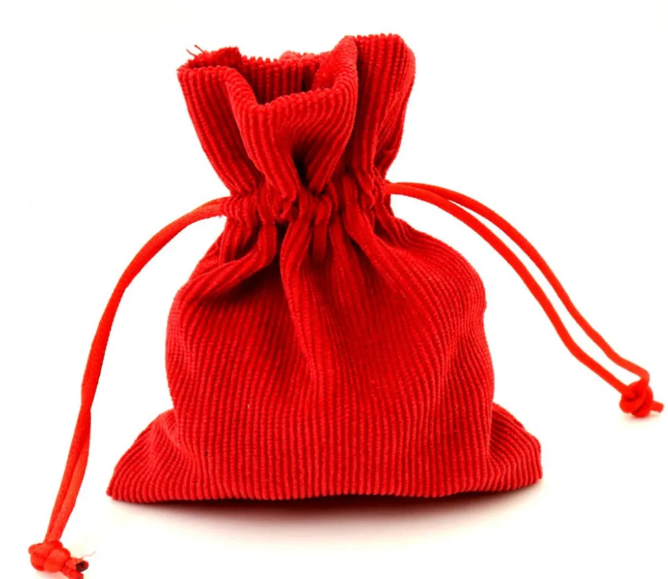 Cordon rouge pour fermer par serrage. On tire sur les ficelles et le pochon se ferme facilement.