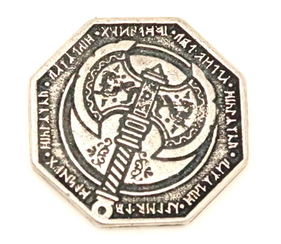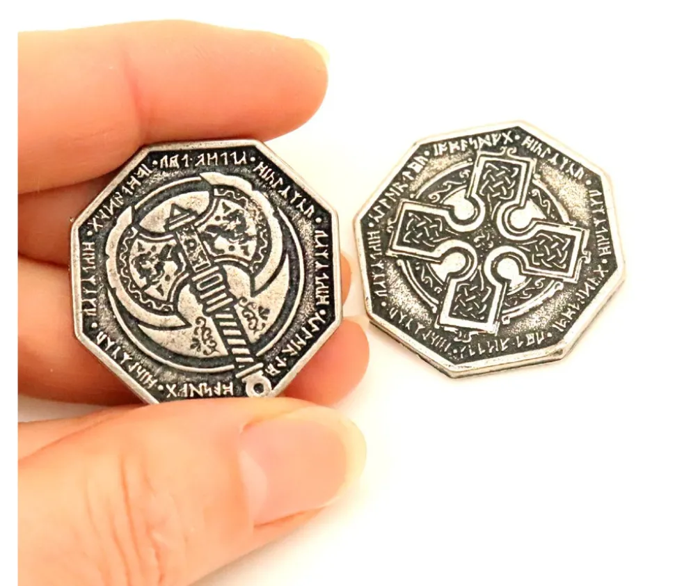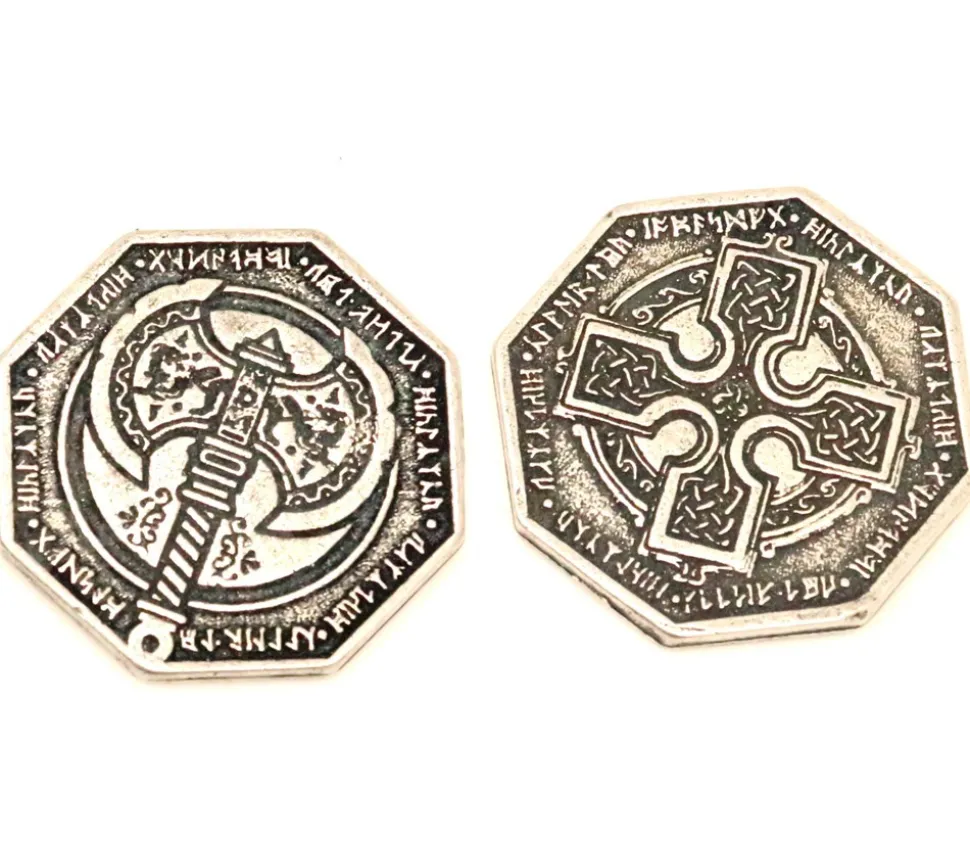 Pièce métal couleur argent passé. Pièce de jeu thème jeu Dwarven avec gravage recto et verso différents. Parfait pour vos jeux de rôle JDR et jeux de société Pièces en métal argenté pour jeu de 3.1 cm de diamètre. Gravées des 2 côtés (1 face hache et 1 face croix) Très belle réalisation en métal pour vos jeux de société. Vente unité. Pièce de 11.3 g assez lourde.