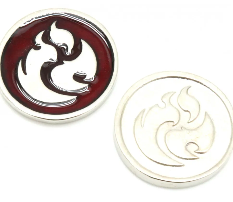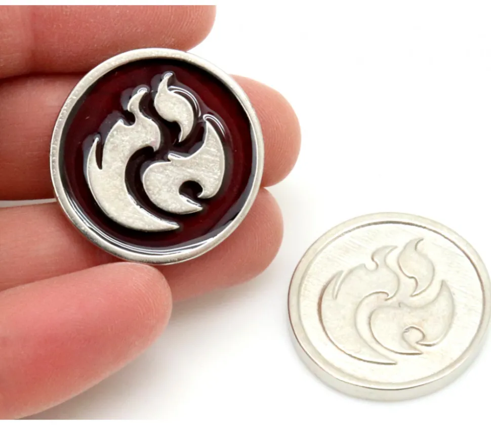 Une pièce métal pour jeu de 2.8 cm de diamètre thème feu. Pièce gravée des 2 côtés avec un motif de flamme pour représenter l’élément feu, recto couleur du métal argent et verso couleur du métal argent avec couleur rouge.