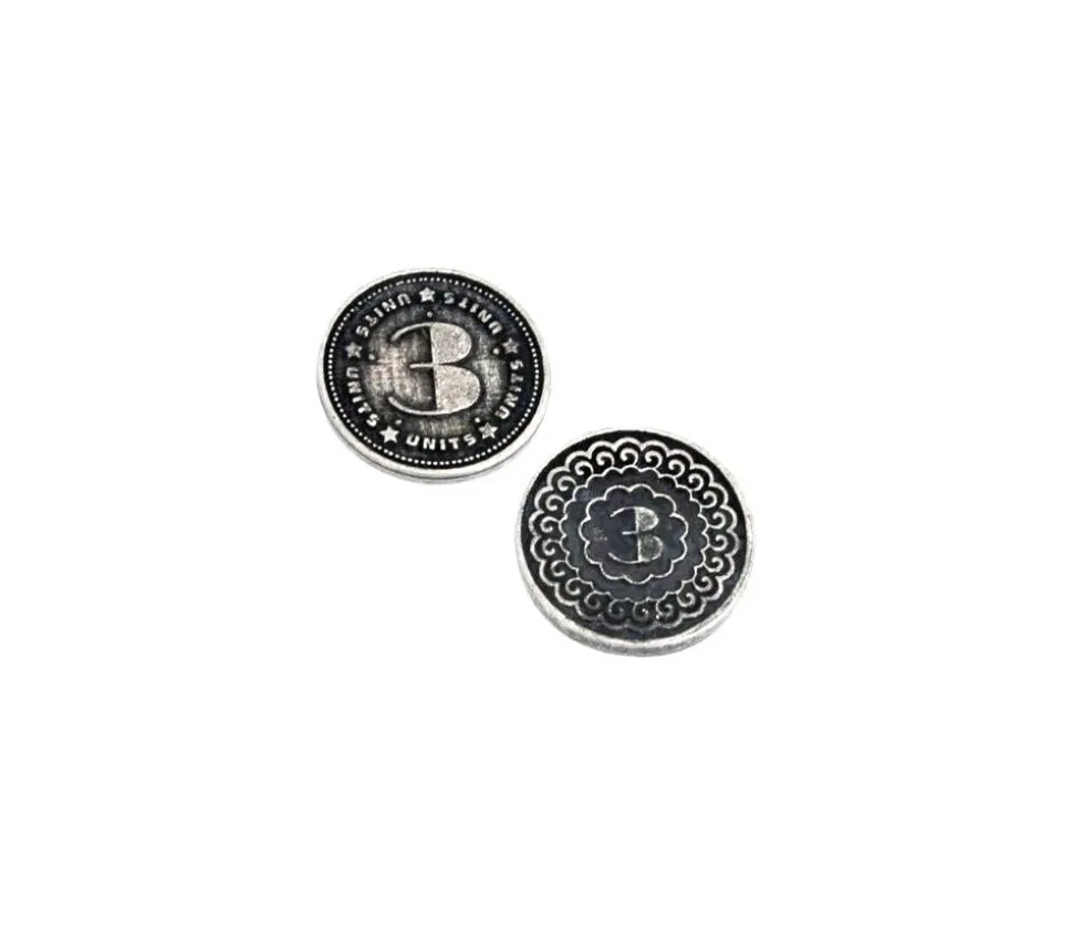 Pièces en métal couleur argentée pour jeu. Jetons métal gravés numérotés 3 des deux côtés pour comptage des points de jeux de société. Pièces en métal couleur argent 2.6 cm. Jeton pièce métallique pour fausses monnaie dans vos jeux. Un accessoire de belle qualité. Vente à l’unité.